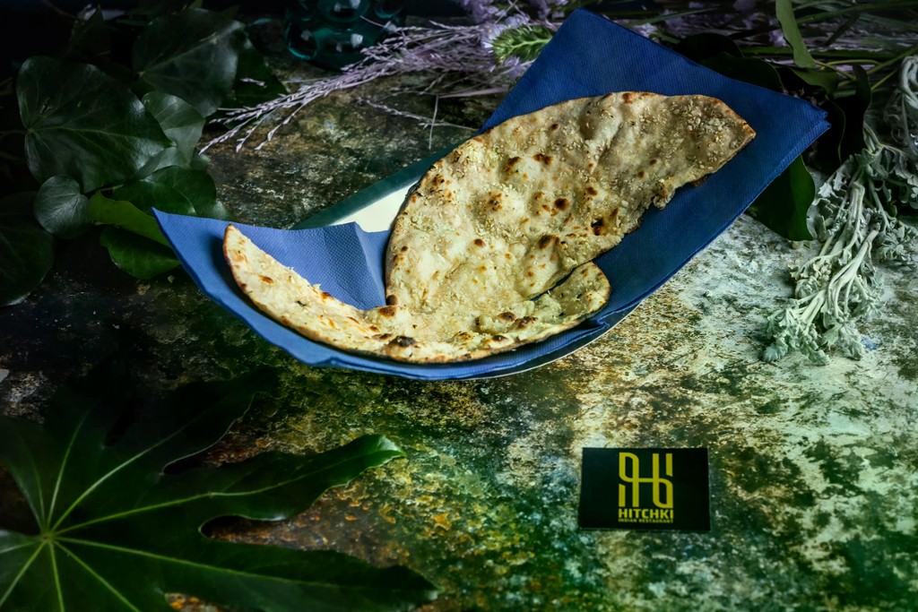 Tradicionális tandoorban sült kovász nélküli teljes kiőrlésű lepénykenyér fokhagymával / Unleavened whole wheat flatbread baked in traditional Tandoor clay oven with garlic