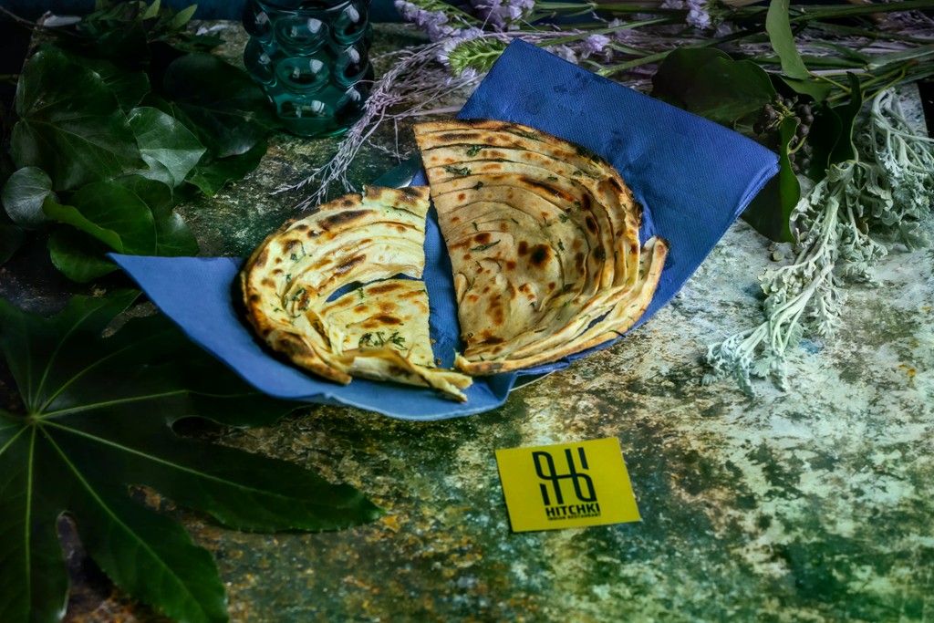Tradicionális indiai réteges tésztából készült sült lepénykenyér, mentával ízesítve / Layered traditional Indian flatbread flavored with mint