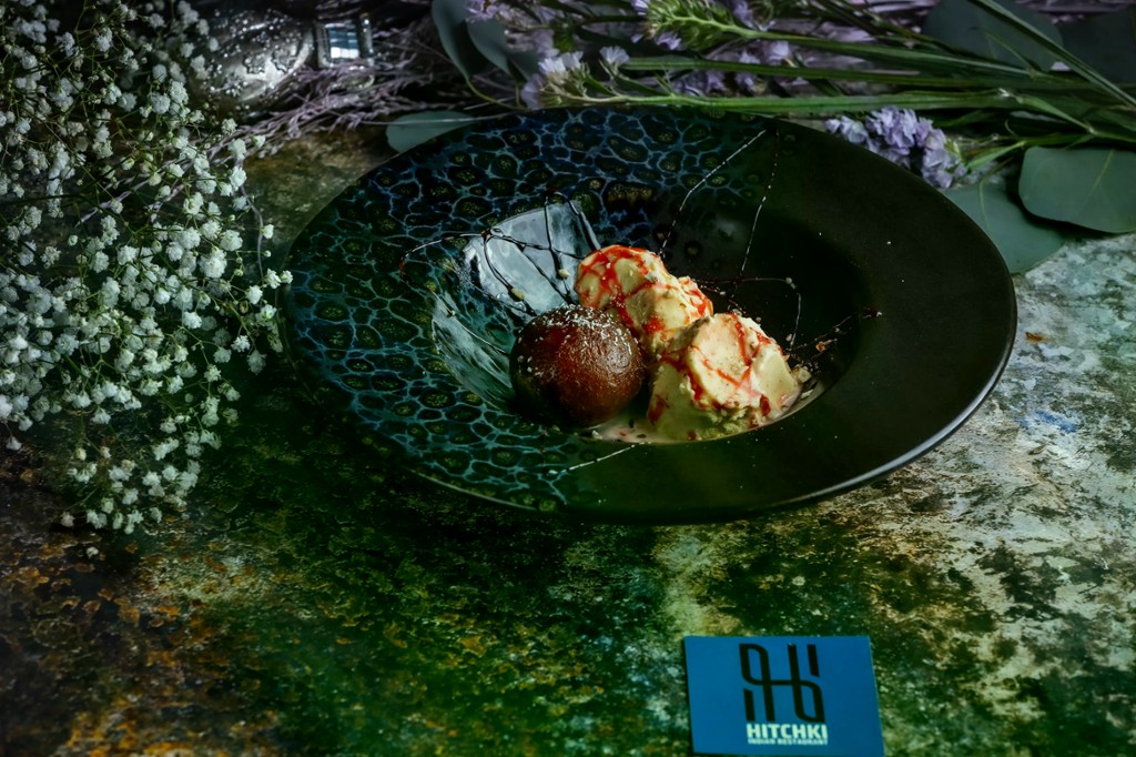 Aranyszínű Gulab Jamun, édes szirupba áztatva vanília fagylalttal tálalva / Golden gulab jamun, soaked in sweet syrup served with vanilla ice cream