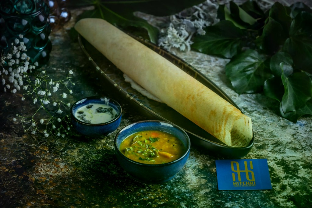 Aranyszínű, ropogós dosa gazdagon vajjal és aromás fokhagymával, sambarral és kókusz csatnival tálalva / Golden, crispy dosa infused with rich butter and aromatic garlic, served with sambar and coconut chutney