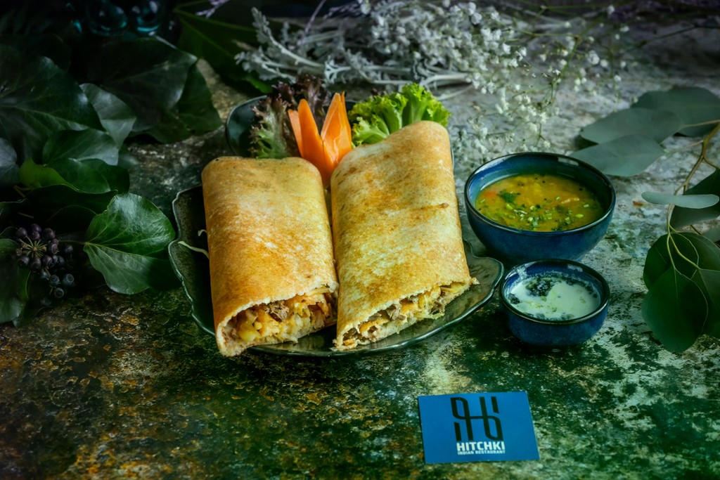 Ropogós dosa zsenge fűszeres bárányhússal és karamellizált hagymával töltve, sambarral és kókusz csatnival tálalva / Crispy dosa filled with tender spiced lamb and caramelized onions, served with sambar and coconut chutney
