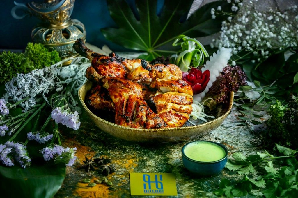 Fokhagymás-gyömbéres, fűszeres joghurtban pácolt, majd tandoorban grillezett egész csirke / Seasoned yoghurt and ginger-garlic marinated whole chicken, grilled in tandoor oven