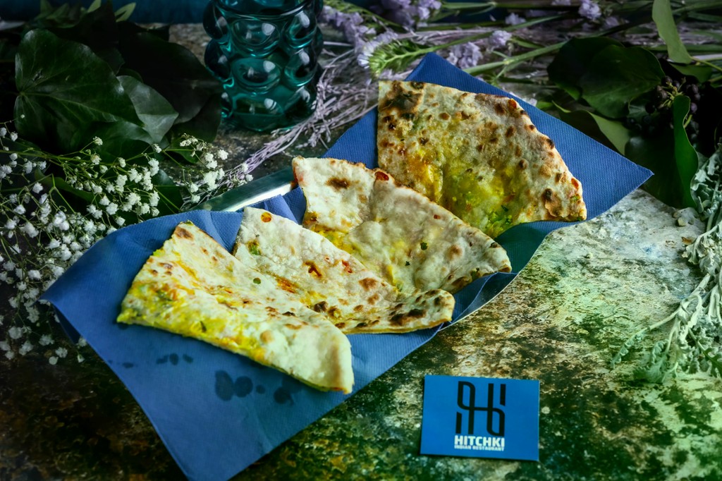 Töltött házi lepénykenyér, fűszeres csicseriborsó curryvel, hagymával és uborka raitával tálalva / Stuffed homemade flatbread, served with spicy chickpea curry, onion and cucumber raita