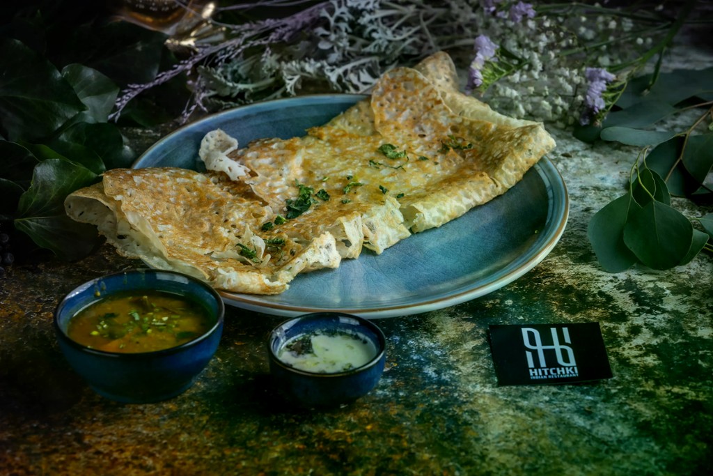 Ropogós búzadara dosa, bőségesen vajazott a gazdag, zamatos íz érdekében, sambarral és kókusz csatnival tálalva / Crispy semolina dosa, generously buttered for a rich, savory flavor, served with sambar and coconut chutney